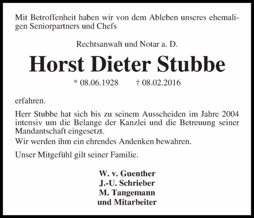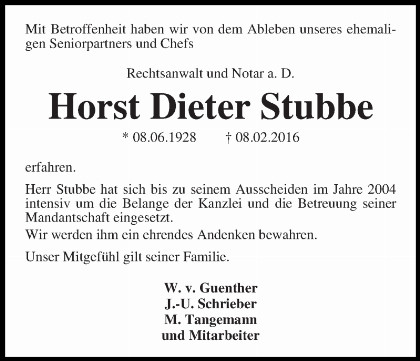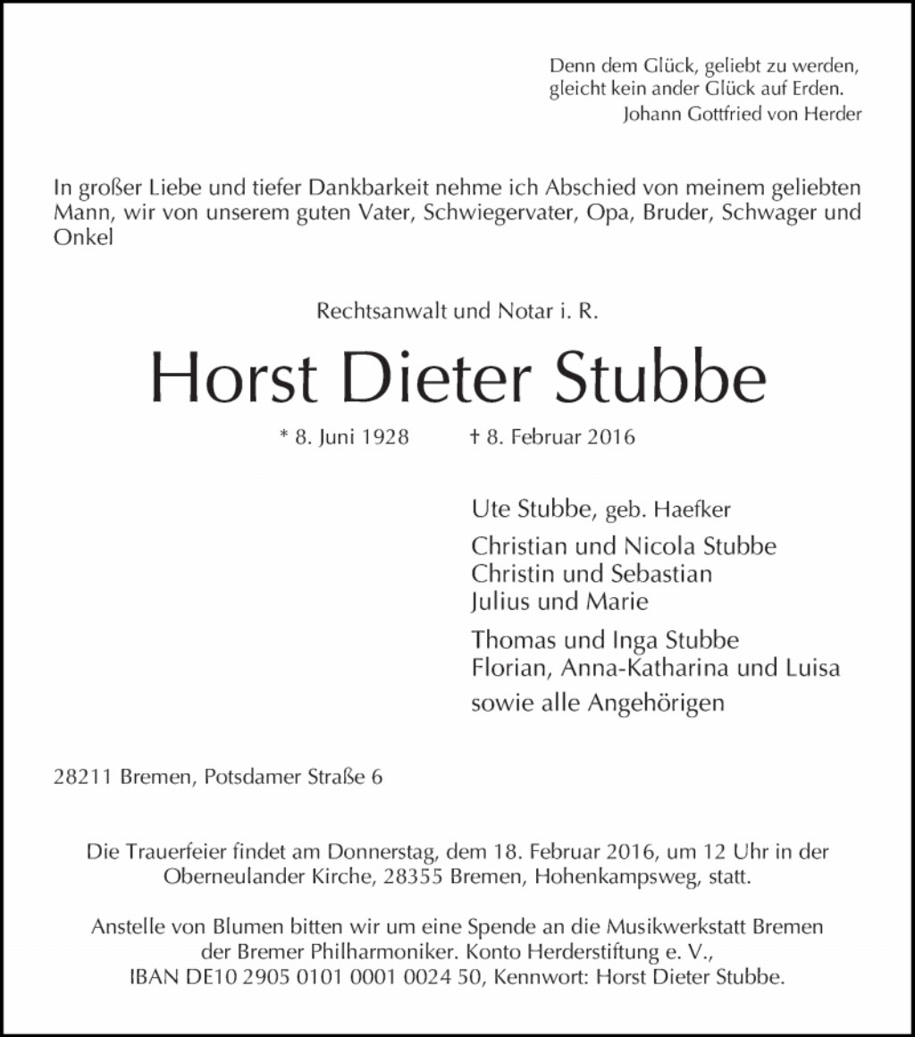 Die Trauerfeier findet am Donnerstag, dem 18. Februar 2016, um 12 Uhr in der Oberneulander Kirche 28355 Bremen, Hohenkampsweg, statt.