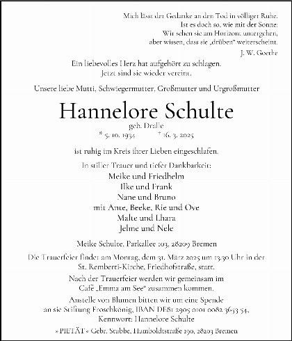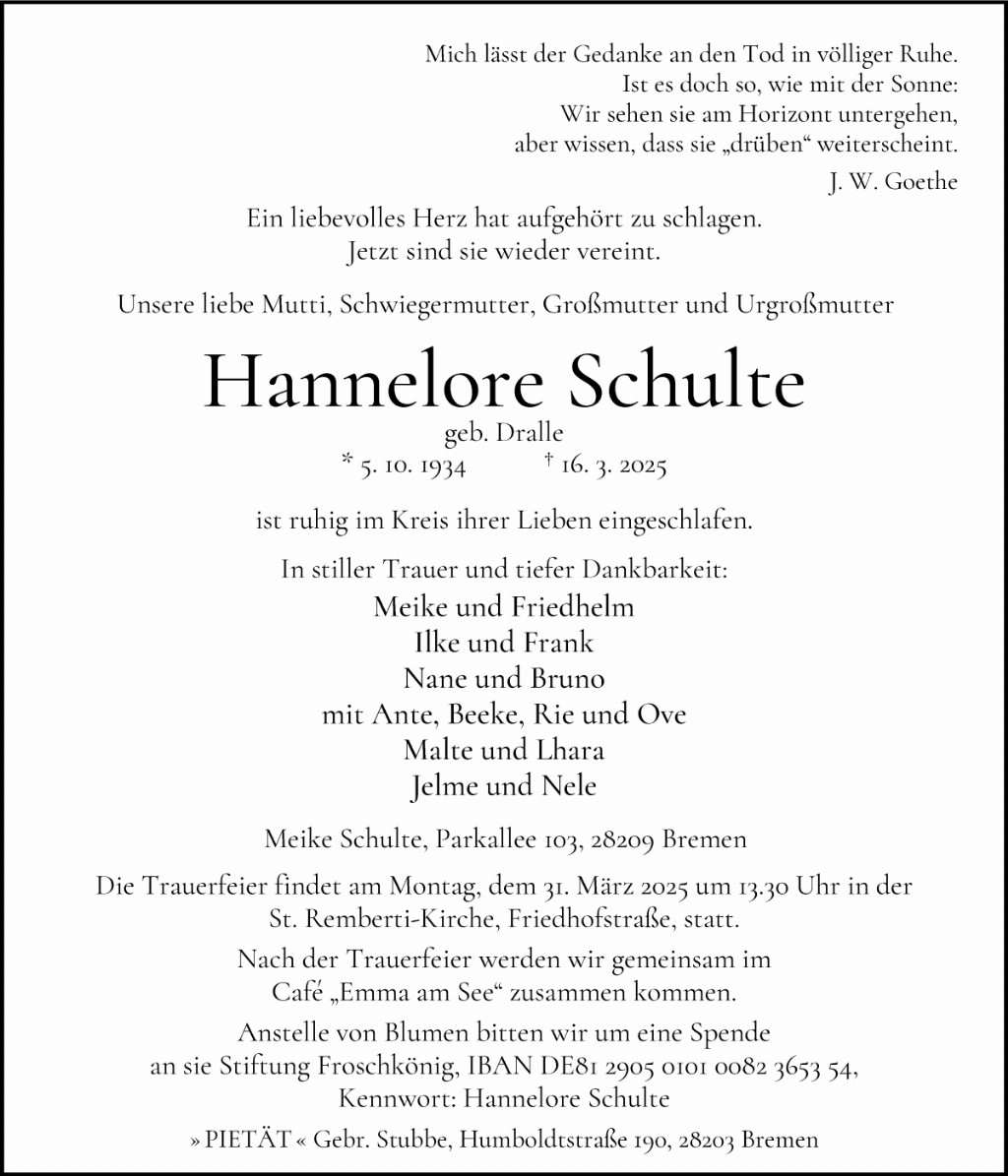 Die Trauerfeier findet am Montag, dem 31. März 2025 um 13.30 Uhr in der St. Remberti-Kirche, Friedhofstraße, statt.