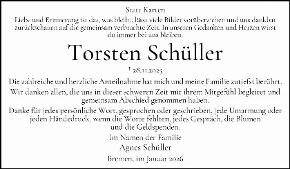 Anstelle von freundlich zugedachten Blumen und Kränzen bitten wir im Sinne von Torsten um eine Zuwendung an: Wildtierauffangstation Rastede e.V., Spendenkonto: IBAN: DE33 2805 0100 0043 3333 35, Landessparkasse zu Oldenburg, Verwendungszweck: Torsten Schüller.